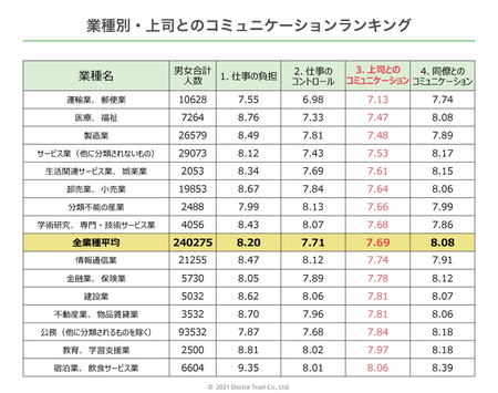 上司とのコミュニケーションがとりづらい、信頼関係が築けていない業種ほど上位にランキングされているといえ、トップは「運輸業、郵便業」でした。「運輸業、郵便業」は、トラックやオートバイ等のドライバーを職業とされている人が多く含まれており、オフィスで働いているような業種にくらべて、コミュニケーションが少ないことが考えらえます。業務上コミュニケーションをとることが少ないと、業務内容や評価といった部分で部下と上司間ですれ違いが起こり不信感につながっていく可能性があります。