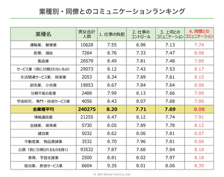 3位「製造業」は、「仕事のコントロール」リスクは平均レベルですが、「上司・同僚とのコミュニケーション」リスクが高く、この点で健康リスクが高いようです。