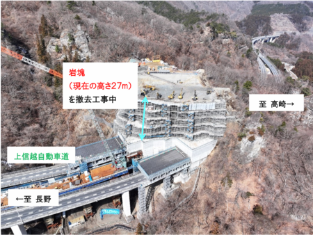 上信越道 松井田妙義(まついだみょうぎ)インターチェンジ(以下「IC」)~碓氷軽井沢(うすいかるいざわ)IC間に位置する北野牧トンネル(長さ190m)上部(群馬県安中市松井田町大字北野牧)に位置する当初高さ70m、平均傾斜角70°の岩塊約95,000m3を掘削し除去する抜本的な落石対策工事です。