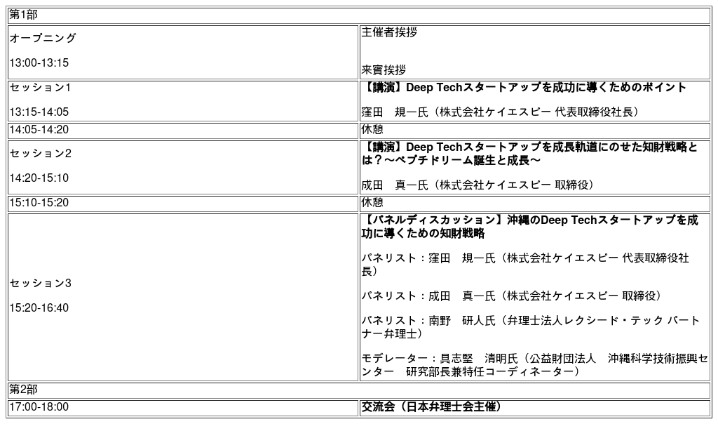 令和7年度第5回目となる「つながる特許庁 in 那覇」では、セッション①【講演】Deep Techスタートアップを成功に導くためのポイント セッション②【講演】Deep Techスタートアップを成長軌道にのせた知財戦略とは?~ペプチドリーム誕生と成長~ セッション③【パネルディスカッション】沖縄のDeep Techスタートアップを成功に導くための知財戦略 をテーマに、企業の取組について情報発信します。