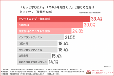 「「もっと学びたい」「スキルを磨きたい」と感じる分野」について尋ねたところ、『ホワイトニング・審美歯科(33.4%)』が最も多く、『予防歯科(30.0%)』『矯正歯科のアシストや調節(24.8%)』と続きました。