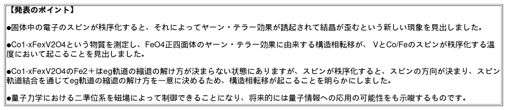 これまで、ヤーン・テラー効果を示す物質はこれまでに数多く知られていましたが、物質の磁性のもととなる電子のスピンがその現象に絡むことはほとんどありませんでした。