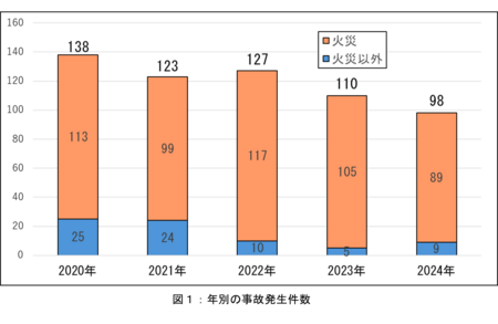 NITEが受け付けた主な暖房器具の製品事故情報について、年別の事故発生件数を図1に示します。毎年約8割以上が火災の製品事故となっており、毎年100件前後発生しています。