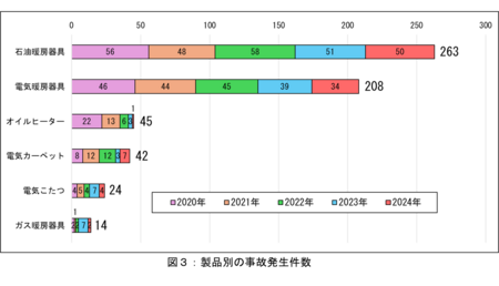 主な暖房器具の過去5年間の製品別の事故発生件数を図3に示します。「石油暖房器具」及び「電気暖房器具」の事故発生件数の割合が毎年高くなっています。
