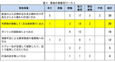 原因の特定ができた事故情報(※9)における事故の事象別ワーストを表4に示します。カートリッジタンクに給油した際の灯油漏れ、洗濯物等の可燃物の接触、ガソリンの誤給油による事故が多くなっています。