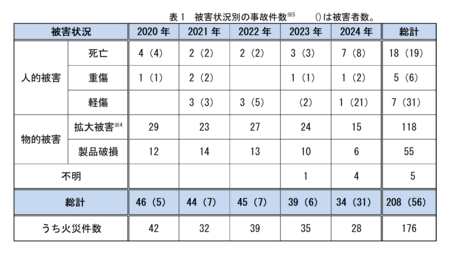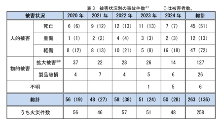 (※7)()は被害者数。物的被害(製品破損または拡大被害)があった場合でも人的被害のあったものは、人的被害に区分している。また、人的被害(死亡・重傷・軽傷)が複数同時に発生している場合は、最も重篤な分類で事故件数をカウントし、重複カウントはしていない。