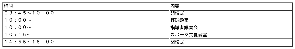 今年度最後の開催となる太田教室では元プロ野球選手の五十嵐亮太氏(ヤクルトOB)、里崎智也氏(ロッテOB)、中畑清氏(巨人OB)、井口資仁氏(ロッテOB)が子どもたち147名に熱血指導する予定です。子どもたちにとって、超一流の講師陣から野球の理論や技術が学べる大変貴重な機会となります。また、指導者を対象とした子どもたちへのトレーニング方法などの講習会や、保護者を対象にした成長期の子どもへのスポーツ栄養管理に関する講習も行います。