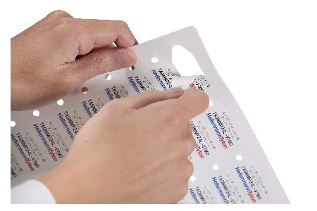 レーザープリンターの差し込み印刷で印字ができ、ハサミなどを使わずに手で剥がして使用することができます。表裏どちらの面にも印刷が可能です。