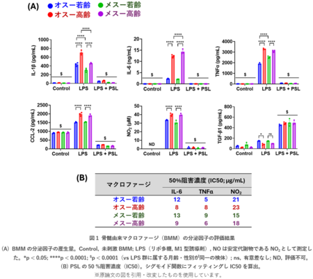 はじめに、月齢(若齢 [3~4カ月齢、ヒト10~12歳に相当]および高齢 [22~26カ月齢、ヒト76~90歳に相当])・性別の異なるマウスから採取した骨髄由来マクロファージ(BMM)について、6種類の分泌因子(IL-1β, IL-6, TNFα, CCL-2, NO, TGF-β1)の産生量を評価しました(図1(A))。これらの分泌因子のうち、IL-1β, IL-6, TNFα, CCL-2, NOは炎症性因子、TGF-β1は非炎症性因子として知られており、炎症性因子はM1型マクロファージのマーカーとして使用できます。まず、未刺激のBMM(Control群)は、CCL-2を除く因子の分泌は限定的でした。BMMにリポ多糖(LPS)という、細菌の表面にある体の免疫を刺激する成分を添加すると炎症性M1型へ分化します。BMMをLPS刺激したLPS群では、雌雄ともに若齢BMMより高齢BMMの方が、M1型マーカーである炎症性因子の産生量が高く、高齢BMMはM1型の性質が顕著であることが分かりました。次に、M1型BMMにPSLを添加し分泌因子のプロファイルが変化するか評価しました(LPS + PSL群)。その結果、いずれのBMMにおいても炎症性因子の産生量の著しい減少と抗炎症性因子の増加が認められ、M2型にスイッチングされることが明らかとなりました。さらに、IL-6、TNFα、NO産生に対するPSLの50 %阻害濃度(IC50)は月齢や性別によらず一定であったことから(図1(B))、PSLは既存のM2型誘導剤とは異なり、汎用的なM2型誘導剤として機能することが実証されました。
