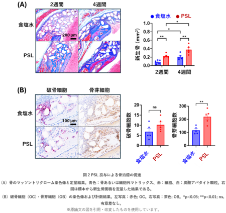 加齢に伴い臓器に蓄積する老化細胞は組織の恒常性を乱し、組織再生能力の低下を引き起こします。例えば薬による老化細胞の除去や若返りに関する基礎研究は、老化組織の再生促進に対し有望性が示唆されていますが、現在のところ少数の報告に限られており、老化組織の再生治療研究はいまだ発展途上です。今回、ホスファチジルセリンリポソーム(PSL)によるマクロファージの表現型の操作が、老化骨の再生の促進に有効であることを実証しました。高齢者は骨がもろいため転倒などによる骨折のリスクが高く、それがきっかけで寝たきり状態に陥り、その結果、筋力低下や認知症発症のリスクが高まります。本技術は、高齢者の骨治癒を促進することで、この連鎖を断ち切れる可能性があり、健康長寿社会の実現や医療費コストの削減を後押しします。