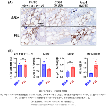 次に、高齢マウスを用いて、PSL投与が骨治癒の促進に寄与するか評価しました。マウスの頭蓋骨に欠損(直径4 mm)を作製し、欠損部に炭酸アパタイト顆粒を埋植後、PSL(あるいは生理食塩水)を1回投与し、2週間後および4週間後に評価を行いました。なお、炭酸アパタイト顆粒は、近年製品化された骨補填材であり、徳島大学口腔外科学分野は、この製品化にあたり動物実験の評価や治験を実施してきました。組織切片を作製し骨再生量を比較したところ、生理食塩水を投与した陰性対照群と比較して、PSL投与群では約2倍速い骨治癒が認められました(図2(A))。次に、2週間後のマウスにおける、骨形成する骨芽細胞(OB)と骨吸収する破骨細胞(OC)を計数したところ、OC数は両群で同数であった一方でOB数はPSL群で2倍多く観察されました(図2(B))。さらに、同時期のマクロファージ表現型の評価では、両実験群で傷害部位における全マクロファージの数は同レベルであったものの、PSL群ではM1型の減少とM2型の増加が認められ、結果としてM2/M1の比率は2.7倍となりました(図3)。以上をまとめると、PSLはM1-M2スイッチングを促進することで、骨治癒が促進されることが実証されました。ほとんどすべての臓器において、老化組織におけるマクロファージ表現型スイッチングの異常が報告されます。したがって、本技術を含むマクロファージ表現型の標的治療は、さまざまな老化臓器の治癒促進に有用である可能性があります。