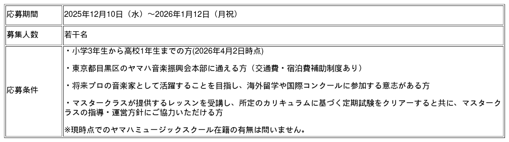 ▼ヤマハ音楽院 ヤマハマスタークラス ピアノ特別コース 2026年度 応募概要