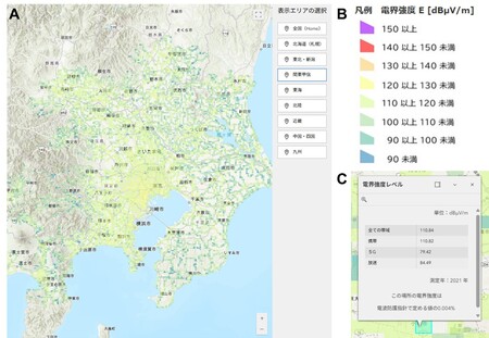 電界強度マップの表示例 A:関東地区の表示例 B:凡例表示 C: メッシュの詳細データ表示例