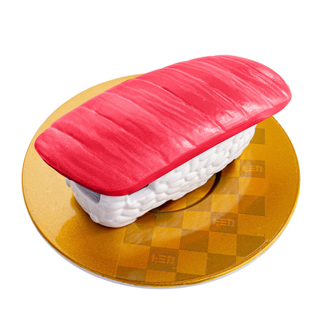 まぐろ本来の色味(赤身の透明感)に近づけるため半透明の材質を使用。さらに細やかかつランダムな凹凸を施すことで切り身を表現しています。