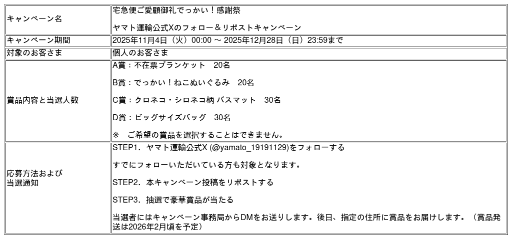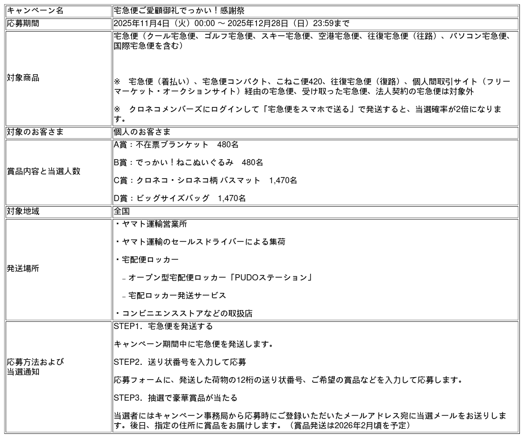 ヤマト運輸株式会社(本社:東京都中央区、代表取締役社長:阿波 誠一、以下:ヤマト運輸)は、日ごろ宅急便をご利用いただいているお客さまに感謝を込めて「宅急便ご愛顧御礼でっかい!感謝祭」を、2025年11月4日(火)から2025年12月28日(日)まで実施します。キャンペーン期間中に宅急便を発送いただき、応募いただいたお客さまの中から抽選で3,900名さまに、本キャンペーンでしか手に入らない豪華賞品をプレゼントします。さらに、ヤマト運輸公式Xをフォローし、本キャンペーンの投稿をリポストすると、抽選で100名さまに豪華賞品をプレゼントします。
