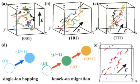 図2 (a)-(c) 電場の向きとLiイオンの運動方向の関係。結晶の向きに関わらず、電場方向にLiイオンが移動している。(d) Liイオンが単独で移動した時の模式図。(e)ノックオン機構の模式図。(f)短時間におけるLiイオンの移動。複数のイオンが同時に移動している様子が見られる。