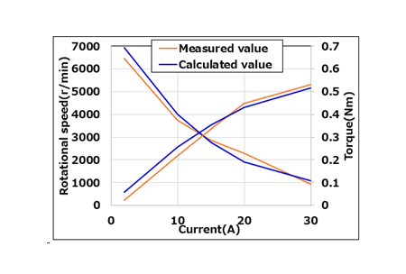 【画像:https://kyodonewsprwire.jp/img/202511058460-O2-jOB6L7BW】 図2. 本磁石を搭載した車載電装モータの特性 (電流値と回転数・トルクの関係、実測値と計算値)
