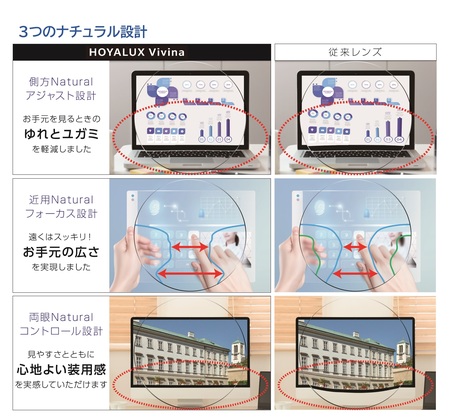 HOYALUX Vivinaは、HOYAのフラッグシップモデル「HOYALUX 極」の設計思想を受け継ぎ、その思想を体現する「3つのNatural設計」によって、快適な装用感と見やすさを提供します。