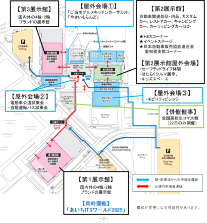 第1・第3展示館に分散して、国産車と輸入車を展示いたします。また、第1展示館には「あいちITSワールド2025」を同時開催いたします。第2展示館では部品、用品、カスタム、キャンピング、レストア関連の展示のほかに、人気のトミカコーナー(初出展)や各種キッズ体験プログラム、イベントステージを実施します。会場周辺の屋外エリアでは、自動運転バスや電動車の公道試乗会をはじめ、モビリティビレッジ(初開催)のほか、はたらくクルマ展示、ご当地グルメキッチンカー、やきいもらんど、キッズスペース等、家族で楽しめるイベントも多彩に実施します。