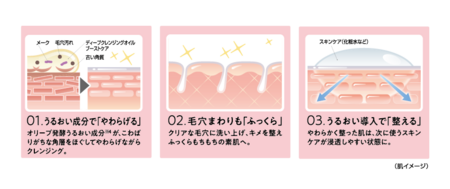 DHCこだわりの「オリーブ発酵うるおい成分※4」を配合した“もっちりとろみオイル”が、こわばりがちな角層をほぐしてやわらげます。気になる毛穴もしっかりと洗い上げ、キメを整えることでふっくらもちもちの素肌となり、次に使うスキンケアが浸透しやすい肌状態へと導きます。