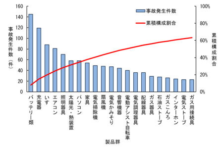 以下の図(報告書 図2)は、2024年度に発生した事故の製品群別の件数と、累積構成割合を示した図です。
