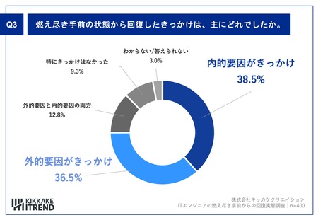 「Q3.燃え尽き手前の状態から回復したきっかけは、主にどれでしたか。」(n=400)と質問したところ、「内的要因がきっかけ(例:考え方を変えた、新しいことを始めたなど)」が38.5%、「外的要因がきっかけ(例:異動、休職、周囲のサポートなど)」が36.5%という回答となりました。
