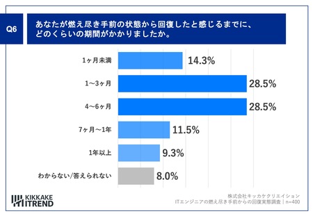 「Q6.あなたが燃え尽き手前の状態から回復したと感じるまでに、どのくらいの期間がかかりましたか。」(n=400)と質問したところ、「1~3ヶ月」が28.5%、「4~6ヶ月」が28.5%という回答となりました。