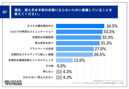 「Q7.現在、燃え尽き手前の状態にならないために意識していることを教えてください。」(n=400)と質問したところ、「タスクの優先順位付け」が34.5%、「1on1での率直なコミュニケーション」が33.3%という回答となりました。