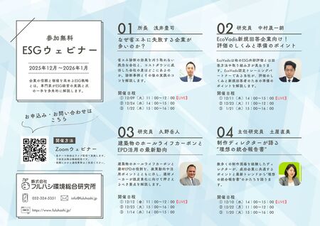 カーボンニュートラル・ESG・環境のコンサルティングを提供する株式会社フルハシ環境総合研究所(愛知県名古屋市、代表取締役 浅井豊司、以下「フルハシ環境総研」)は、毎回多くのご参加をいただいている参加費無料の「ESGウェビナー」の2025年度第2弾を12月9日(火)よりスタートします。