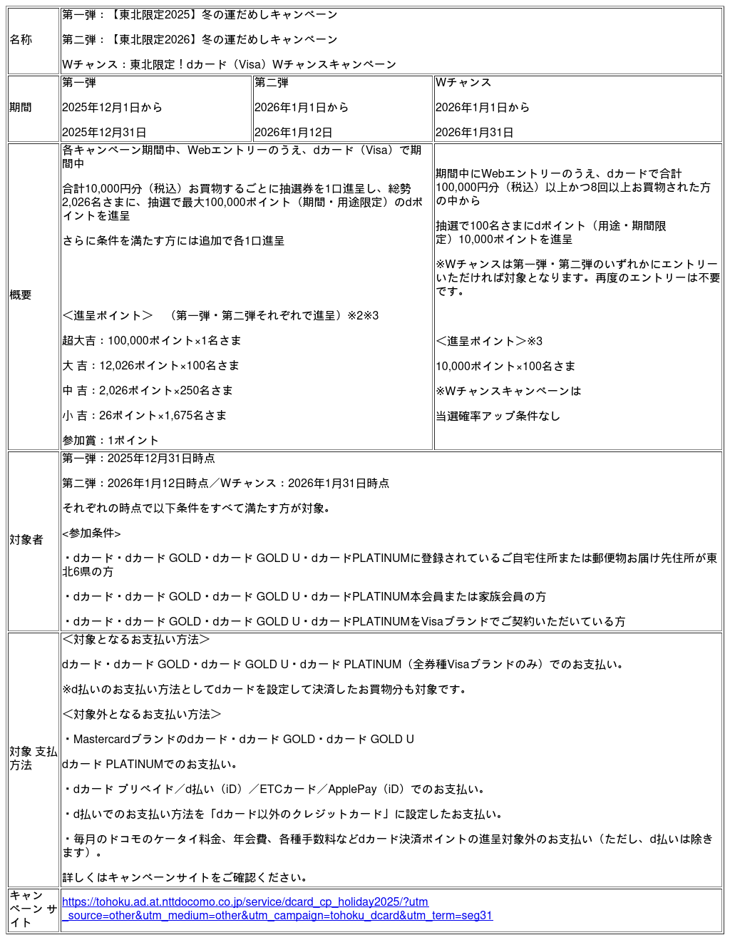 株式会社NTTドコモ(以下、ドコモ)が提供する「dカード(Visa)」でお買物いただいたお客さまを対象とした「【東北限定】冬の運だめしキャンペーン」(以下、本キャンペーン)を2025年12月1日(月)から2026年1月31日(土)までの期間で開催いたします。