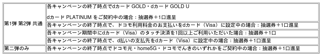 本キャンペーンは、各キャンペーン期間中、Webエントリーのうえ、dカード(Visa)で期間中合計10,000円分(税込)お買物するごとに抽選券を1口進呈し、総勢2,026名さまに、抽選で最大100,000ポイント(期間・用途限定)のdポイントを進呈いたします。 さらに、各条件※1を満たした方には追加で抽選券を1口ずつ進呈いたします。抽選は、本キャンペーン終了後に実施し、当選された方へ2026年3月下旬から順次ポイントを進呈いたします。