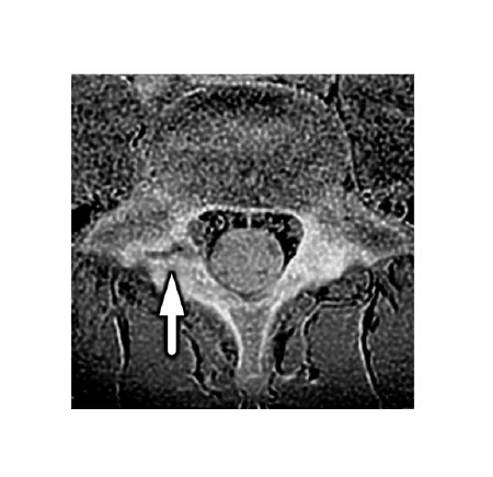 図2: 腰椎分離症のMR画像(画像は腰椎の水平断面を示す。矢印は腰椎分離症の病態箇所である)