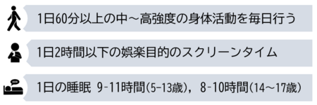 3つの推奨事項の遵守数の多さや、特定の遵守の組み合わせが、子どもにおける体力の高さ、肥満や心代謝リスクの低さ、認知機能や学力の高さ、主観的な健康感や生活の質の高さと関連することが、これまでの研究で示されています。