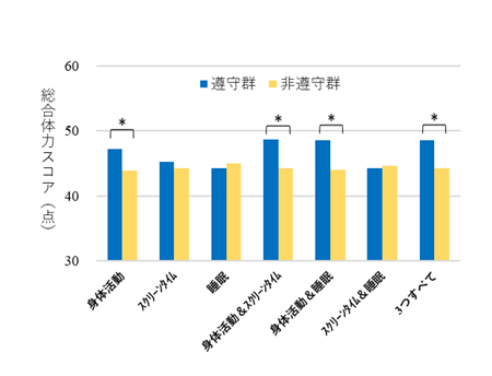 ●小学校の児童307名が分析対象となり、「1日60分以上の中~高強度の身体活動(徒歩、外遊び、スポーツなど)を毎日行っている」子どもは、総合体力および多くの種目のスコアが高いことが示されました。さらに、この身体活動に加え、「1日2時間以内の娯楽目的のスクリーンタイム」や「1日9~11時間の睡眠」のいずれか、またはその両方を満たした子どもは、そうでない子どもに比べて体力テストのスコアがより高い傾向がみられました。