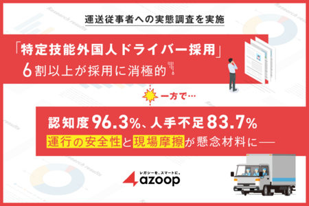 株式会社 Azoop(本社:東京都港区、代表取締役社長 CEO: 朴 貴頌、以下「Azoop」)は、2024年12月に開始した特定技能外国人ドライバー制度について、運送従事者111名を対象に実態調査アンケートを実施しました。その結果、運送会社の人手不足感(83.7%)と制度の認知度(96.3%)が高いにもかかわらず、6割以上(64.8%)が特定技能外国人ドライバーの採用に消極的でした。また、運行の安全性、日本人ドライバーとのコミュニケーションや文化の違いが懸念であり、採用検討層・消極層ともに行政や支援機関に費用・教育・トラブル発生時の支援を求めていることも明らかになりました。