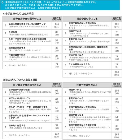 5. 2026年の世の中に対する小中学生の期待、願望は「平和で戦争のない世界になる」「物価が下がる」こと。