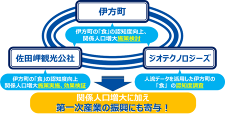 本協定は、「伊方町の『食』を全国に!」をキーワードに、三者が連携して、人流データを用いた認知度調査を基盤とし、その結果を活用したプロモーション施策の企画・実施・評価を一体的に進め、地域の食文化を軸とした関係人口の増大に加え、第一次産業の振興にも寄与すると考えています。