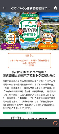 なお、現在モバイルチケットでは、とさでん交通の電車市内均一区間と全線が乗れる「電車市内一日乗車券」「電車全線一日乗車券」、宿泊観光に便利な「電車市内24時間乗車券」「電車全線24時間乗車券」、路面電車と路線バスが乗り放題になる「バス・路面電車一日乗車券」も好評販売中です。