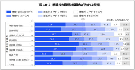 職種による偏りが見られ、「技術職(IT系)」、「技術職(技術系)」、「専門職(士業、医療など)」などが早期決定している一方、「製造・生産」は離職前の割合が群を抜いて低い(19.1%)。