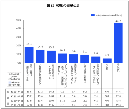 後悔した点がある者の中では、「給与・待遇が期待以下だった」が最多(18.1%)となり、特に50代後半で割合が高かった(22.8%)。