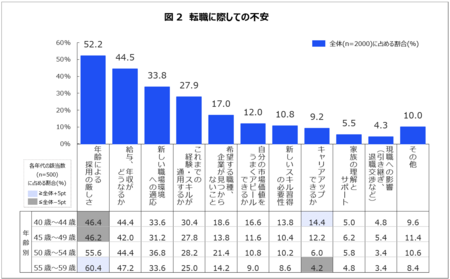 「年齢による採用の厳しさ」(52.2%)、「給与、年収がどうなるか」(44.5%)、「新しい職場環境への適応」(33.8%)が上位3項目となっている。「年齢による採用の厳しさ」は年齢が上がるにつれて割合が高くなる傾向があり、50代後半は特に高い(60.4%)。