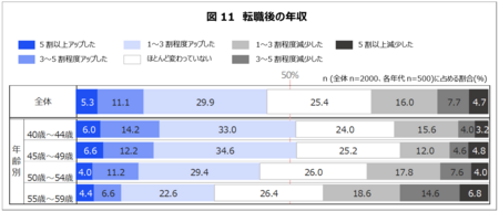 転職により年収がアップした者は、半数近く(46.3%)を占める一方、年収減少は約3割(28.4%)となっており、50代前半までは処遇改善傾向にあるが、50代後半になると年収アップは約3分の1(33.6%)にとどまる。