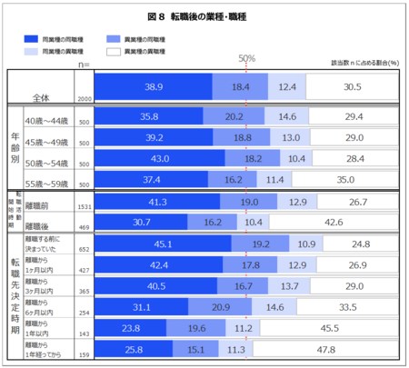 また、転職先の決定時期から見ても、離職前に転職先決定した者のうち、半数近く(45.1%)が「同業種の同職種」であるが、離職から期間が開くにつれて異業種や異職種への転職が概ね増加する傾向にある。