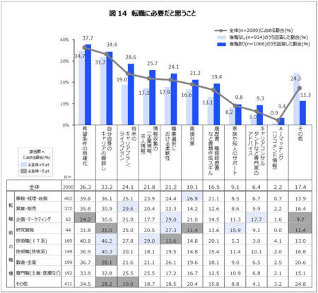 転職前の職種別では、「技術職(IT系)」や「技術職(技術系)」で「自分自身のキャリアの棚卸し」が高く、これまでの技術が通用するか否かの見極めが特に重要視されているほか、「企画・マーケティング」など求人が少ない職種においては、キャリアチェンジを踏まえた「職業選択における柔軟性」、「キャリアコンサルタントなど専門家のアドバイス」等も必要としていることが分かった。