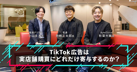 電通・電通デジタルはTikTok for Businessと協力し、「TikTok Market Scope」のデータも活用しながら「実店舗購買」に対する定量的な広告効果の測定に挑戦しました。TikTok広告は、ユーザーの実店舗購買にどう影響するのか?TikTok for Business Japanの秋葉大輔氏と電通デジタルの小山圭太氏、電通の井崎正太郎氏にお話を伺いました。記事を読む