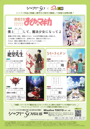 公益財団法人 日本漢字能力検定協会(代表理事 理事長:山崎信夫/所在地:京都市東山区/以下、当協会)は、アニメーションスタジオの株式会社シャフト(代表取締役:久保田光俊/所在地:東京都杉並区/以下、シャフト)が手掛ける作品とコラボレーションした「シャフト 漢字検定」を当協会ホームページ等にて公開いたします。2025年で共に50周年を迎える当協会とシャフトによる特別企画として、どなたでも無料でオリジナルの漢字問題に挑戦いただけます。
