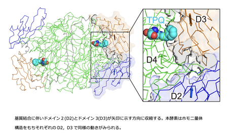 さらに,本酵素の触媒過程での構造変化は活性中心のみで起こると従来は考えられていましたが,基質結合に伴いドメインレベルでの構造変化が起き,これに連動して活性中心での構造変化が進行することが明確になりました(図2)。