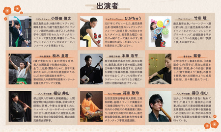 鹿児島にゆかりのあるパフォーマーによる日本の伝統的な琴や尺八に三味線、和太鼓の演奏に加えて、マジックやバルーン、ジャグリングなどの多彩なステージイベントをはじめ、かるたや羽子板、コマ回しなどお正月の伝統的な遊びを楽しめるコーナーもご用意。ビュッフェレストラン「霧島湯けむりテラス」では、大晦日の年越しそばや、三が日の朝食にはおせち料理コーナーやお雑煮の提供を行います。