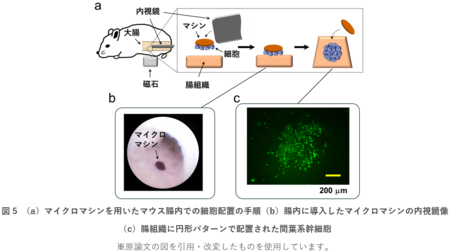 次に、マイクロマシンを用いて潰瘍性大腸炎モデルマウスの損傷した腸組織に治療効果がある間葉系幹細胞の配置を行いました(産総研の動物実験に関する倫理委員会のガイドラインに従って実施)。図5aにマイクロマシンを用いた腸内での細胞配置の概要を示します。微小なマイクロマシンを長距離にわたって磁力による遠隔操作で操縦し、体内の目的地に到達させるのは現在の技術では困難です。そこで今回、内視鏡を用いて腸内の標的部の真上であらかじめ間葉系幹細胞を捕捉させておいたマイクロマシンを放出し、体外に設置した磁石で引き寄せることで、磁力によるマイクロマシンの操作区間をごく短い距離に限定して標的部にマイクロマシンを到達させました。図5bは、腸内に導入した直径約0.5 mmの円形のマイクロマシンです。マイクロマシンから細胞を脱離させ、腸組織に細胞を配置した様子を図5cに示します。間葉系幹細胞の円形パターンが観察され、マウスの腸内においても短時間で望みのパターンで細胞を配置することができました。なお、細胞配置後のマイクロマシンは、排泄物と一緒に体外に排出されます。