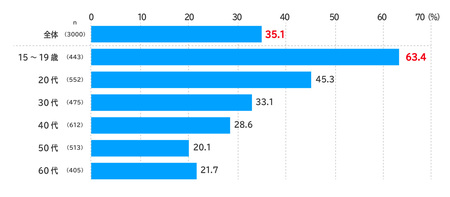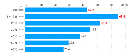 ・一方で、AIを利用する際に「楽をしていると思われる」ことが心配な人は42.2%。世代別では、15~19歳が最も多く63.4%、20代が51.3%と続く。【図表10】